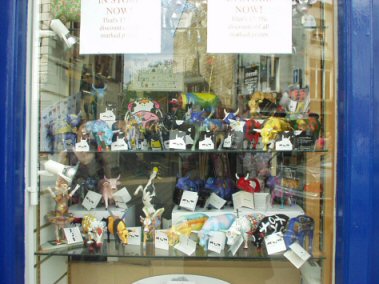 Photo of some painted cows in a shop window